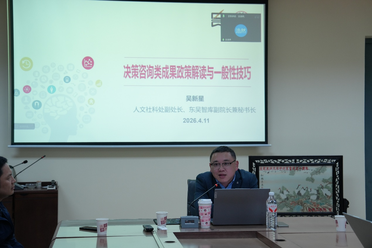吴新星副处长以决策咨询类成果政策解读与报告撰写为主题开展专题讲座。他围绕决策咨询成果定义、分级认定、报送渠道、激励政策等核心内容,系统解读学校相关管理办法,明确A1—C类成果对应论文等级与奖励标准;结合我校近年成果刊发与批示数据,重点讲解内参撰写的“3693”黄金法则,从思想高度、视野宽度、积淀厚度、问题锐度、责任强度五个维度,阐释高质量决策咨询报告的撰写逻辑与实操技巧,并结合文化遗产、古城保护、文旅融合、地域文化建设等文科特色方向,提供可直接参考的选题思路与案例示范。